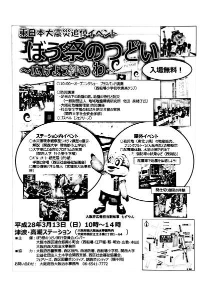 3月13日(日)の10時〜14時に津波・高潮ステーションで東日本大震災の追悼イベントが行われます。