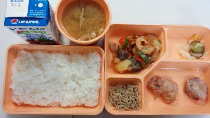 今日の給食は、じゃこごはん、鶏肉の塩焼き、ちくわとじゃがいもの煮もの、はくさいの酢のもの、豚汁、米飯、牛乳でした。