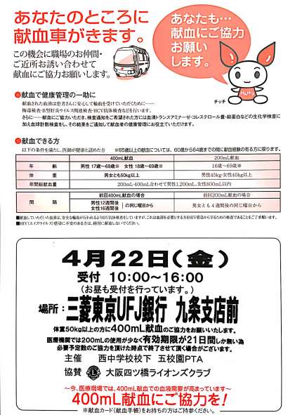 今年も、4月22日(金)に西中校区五校園PTAの献血が実施されます。