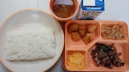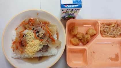 今日の給食は牛肉と卵のクッパ(牛肉とニラの煮もの、錦糸卵、野菜スープ)でした。