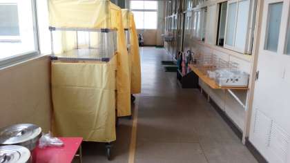 1階の配膳室が混雑するので、1年生は、4時限目終了までに職員が3階の廊下まで、ご覧のような配膳コンテナを運んで、配膳しています。