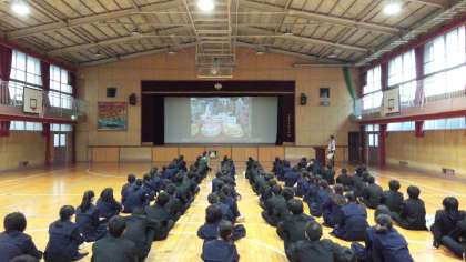 5時限目、体育館において、3年生修学旅行説明会が行われています。