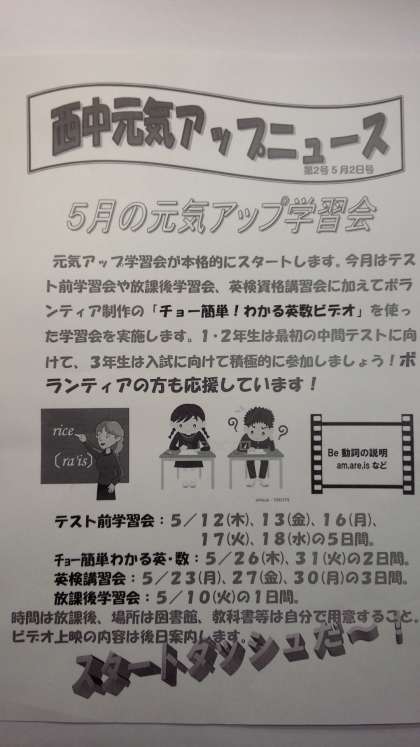 本日、「西中元気アップニュース」を全生徒に配付していますので、ご確認ください。