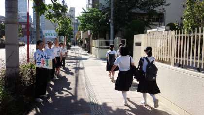 朝早くから、生活委員が登校してくる生徒たちにポスターを持って呼びかけています。