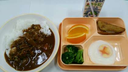 今日は、みんなの好きなハヤシライスです。牛肉・にんじん・たまねぎ・トマトビューレと、具材が豊富なうえに、ボイルブロッコリーを入れて食べました。