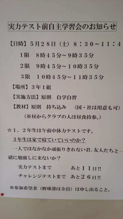 3年生の皆さんも、実力テストに向けて、いつも通り起きて、しっかり学習しましょう!