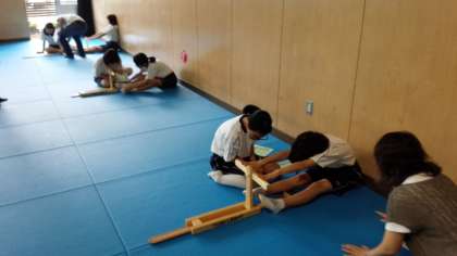 武道場では、2年生女子が、まず長座体前屈、上体起こしです。