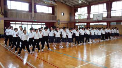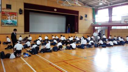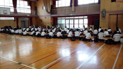 写真は、体育館での、1年生の一泊移住前日指導の様子です。