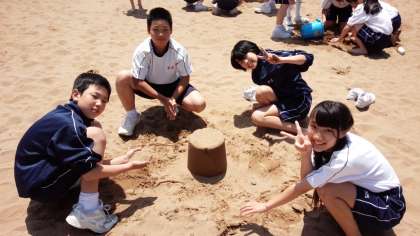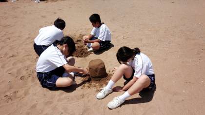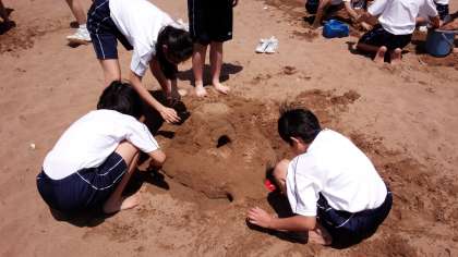 きれいな砂浜でサンドアート制作の様子です。