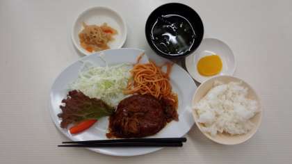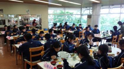 泊行事での楽しみの一つ、夕食タイムです。ハンバーグ定食にご飯が進みます。外はまだ明るく、普段より早い夕食ですね。しっかり食べて、この後の活動で学級・学年の絆を深めましょう。