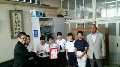 西中学校生徒会は、5月10日から4日間に渡って、学校正門前と九条商店街で熊本地震災害義援金を呼びかける募金活動を行いました。本日、大阪市教育振興公社「大阪市PTAだより編集室」から担当者が来られ、生徒会メンバーがその活動について取材を受けました。この日は、大阪市PTA協議会小林会長もお見えになったので、生徒会代表がその義援金の23万4,475円お預けしました。