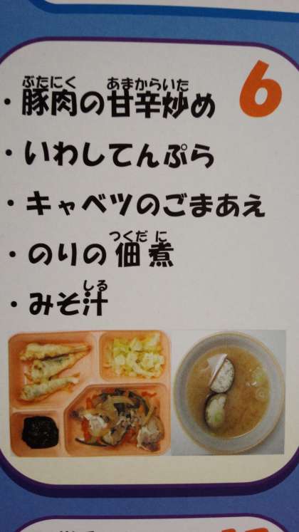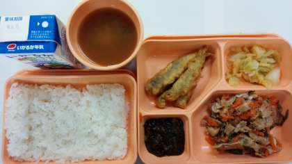 今日の給食は、のりの佃煮、なすびの味噌汁という和食の定番です。