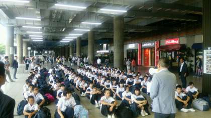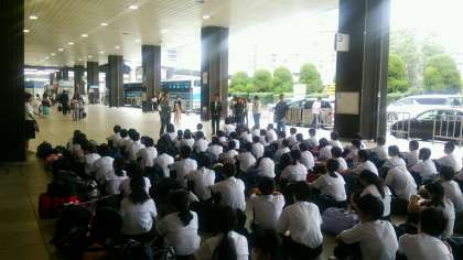 いよいよ修学旅行になりました。出発式での様子です。たくさんの保護者の方と教員の方がお見送り来られました。