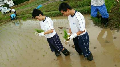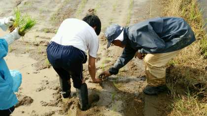 おじさんの指導を受けて田植えを経験しています。