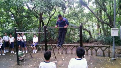 学年主任を中心に鉄棒運動です。