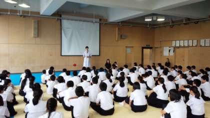 2年生は、武道場で学年集会です。今日は、湯谷先生のお話です。