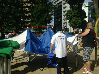 『どんとこいまつり』、PTAの方々が朝早くから準備されています。今日は暑く暑くなりそうです。