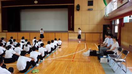 5時限目、体育館に整列して、3−3中森さんの司会のもと、3−1小林さんから「はじめのあいさつ」をしました。