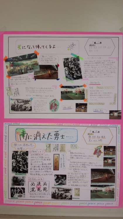 下2枚は、平和学習の班ごとのまとめです。廊下に掲示されていますので、ぜひご覧ください。