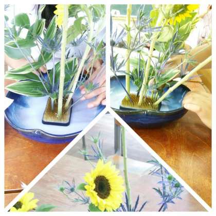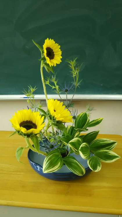 今日は、夏を代表する「ひまわり」を中心に小原流の先生から生け方をご指導いただきました。その過程をご覧ください。