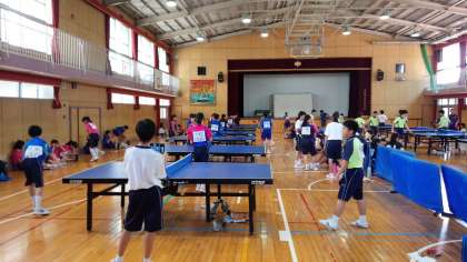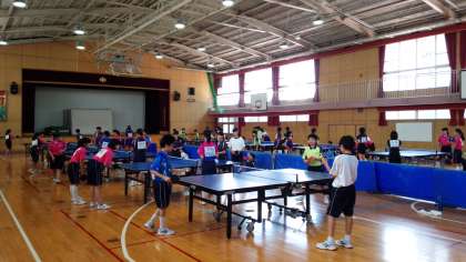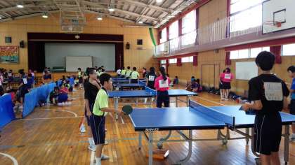 体育大会集団演技練習に続いて、8時30分からは、体育館において、卓球部が練習試合を行っています。