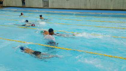 恒例の校区小学校児童による水泳講習会が行われました。35度を超える環境のもと子どもたちは緊張感の中にも中学校プールの大きさと児童には十分な深さのプールで思い存分泳いだことだと思います。