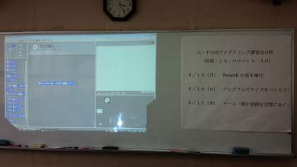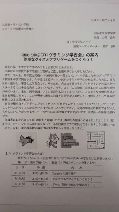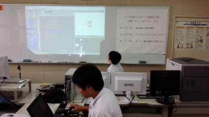 今回のプログラミング学習会は、本校パソコン部が、小中学生の初心者のために、自分たちで企画・検討し、準備しています。