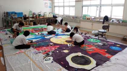 以前にも、お伝えした、文化発表会に展示する、美術部「巨大壁画」も、だいぶできあがってきました。