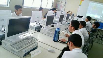 指導する三年生パソコン部の男子二人は、机間指導しながら、適切なアドバイスをおこなっていました。また児童の新たな発想を紹介するなどして、学習会を盛り上げていました。