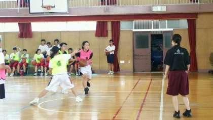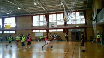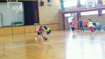体育館では、女子バスケットボール部が3校集まって練習試合をおこなっていました。
