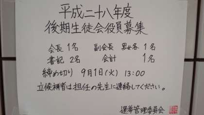 始業式での、選挙管理委員長の福田くんよりの口頭での選挙公示ののち、公示ポスターが掲示されました。