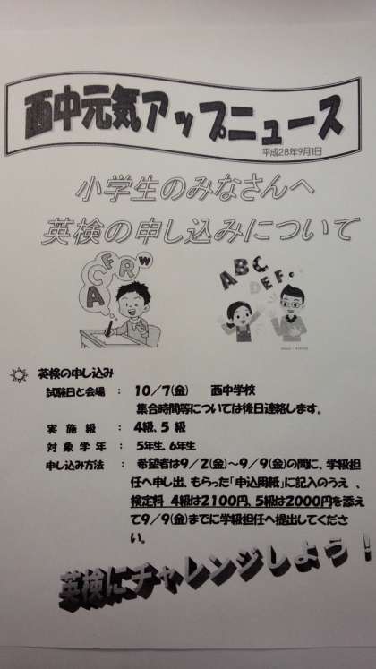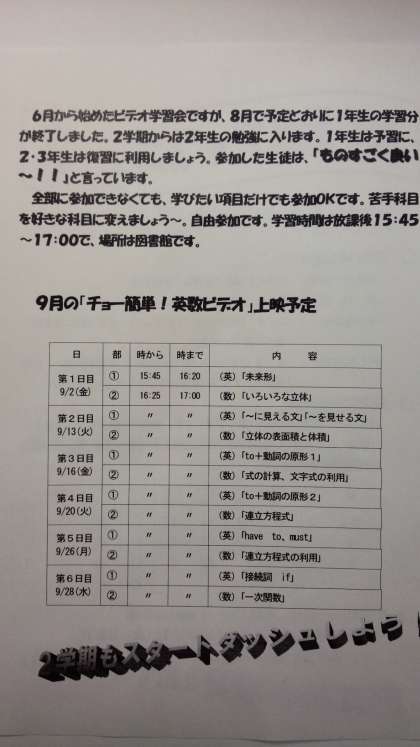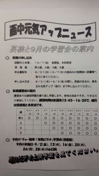 「英検の申し込みと試験日」について、そして、9月の「英検講習会」「英数ビデオ学習会」についてのお知らせです。