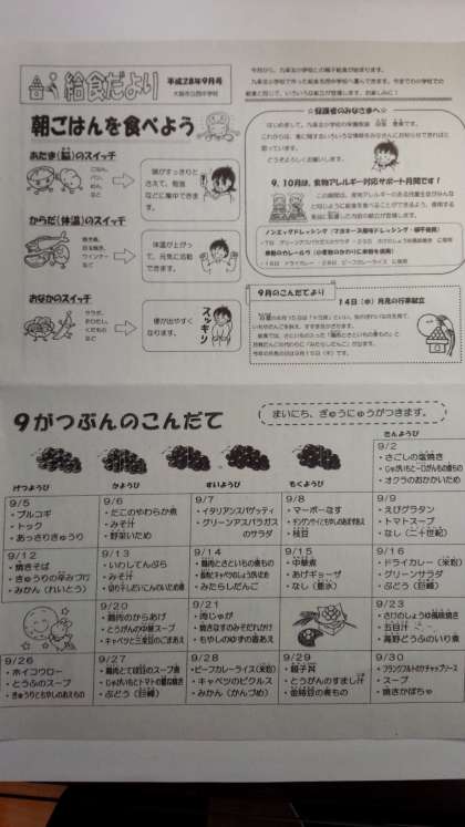 九条北小学校の栄養教諭の田坂先生が、西中学校のために「給食だより」をつくってくださいます。