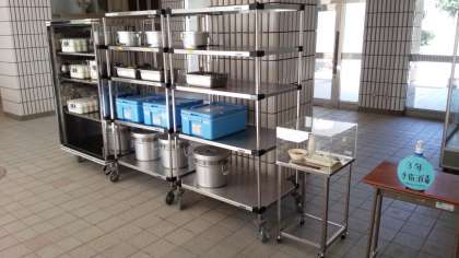 12時35分、配膳員さんがラックに載せ替えて、各学年ごとに配置が完了しました。
