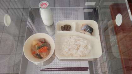 生徒たちは、手指の消毒をして、この給食見本を見て、各クラスで配膳します。