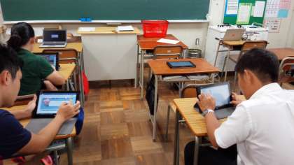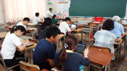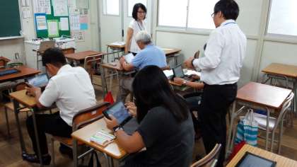 先生方が、実際にタブレットを手にして操作研修を行いました。
