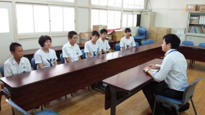 給食後、3年生学級代表が、会議室でインタビューに答えました。