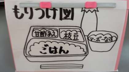九条北小学校の栄養教諭の田坂先生が、一番下の写真のような、「もりつけ図」をつくってくださいました。