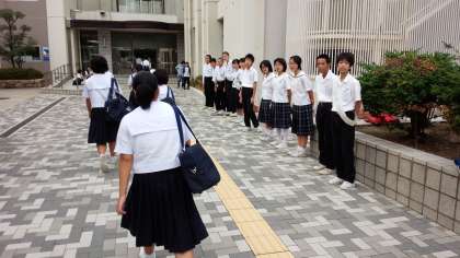 正門では、朝8時から、後期生徒会役員立候補者が、タスキをかけて、あいさつ運動を行っています。