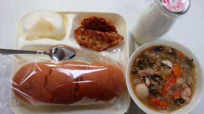 本日の献立は、中華煮、あげギョウザ、レーズンパン、なし(豊水)です。