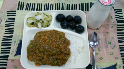 今日は生徒たちの好きなドライカレーです。温かご飯に熱々のドライカレーをかけました。部屋中にカレーの香りが漂い、食欲が増します。教室でおかわりする生徒がたくさん出るのではないでしょうか。