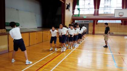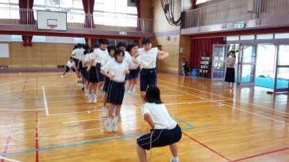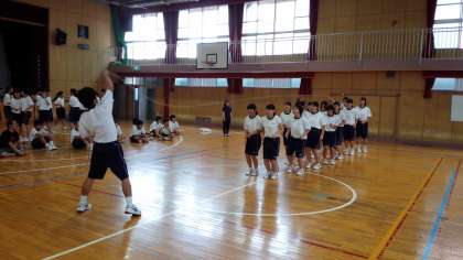 2年生は、体育館で、体育大会の団体種目「大縄跳び」の取り組みをしています。