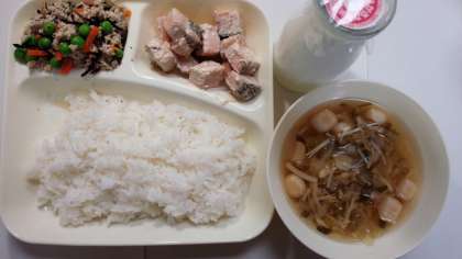 本日の献立は、さけのしょうゆ風味焼き、五目汁、高野どうふのいり煮です。
