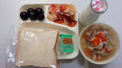 本日の献立は、鶏肉とてぼ豆のスープ煮、じゃがいもとトマトの重ね焼き、食パン、いちごジャム、ぶどう(巨峰)です。