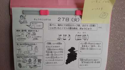 久しぶりの洋食です。じゃがいもとトマトの重ね焼き、ぶどう(巨峰)は、ほとんど残食がありませんでした。