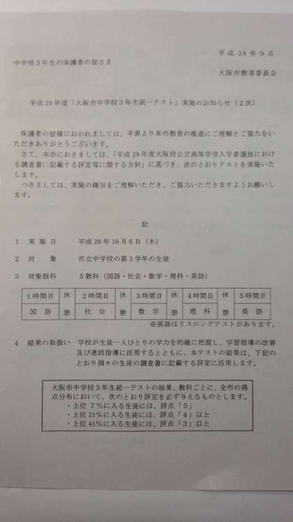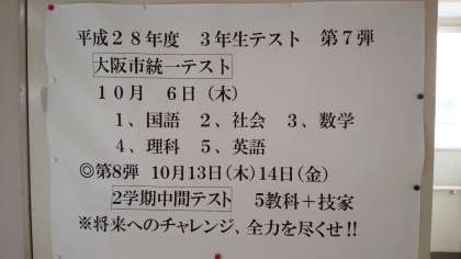 本日、「大阪市中学校3年生統一テスト」が実施されています。最後まで諦めずにがんばってほしいと思います。