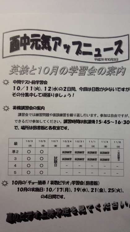 明日、「第2回実用英語技能検定試験」が実施されます。申し込んでいる生徒は、しっかりと準備してください。