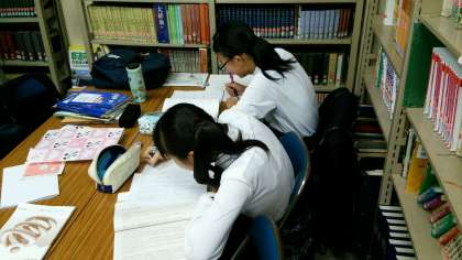 明日から中間テストです。1年生の女子生徒がテストに向けて自主学習に取り組んでいました。分からないときは、友人に尋ねながら能動的に学習に励んでいました。