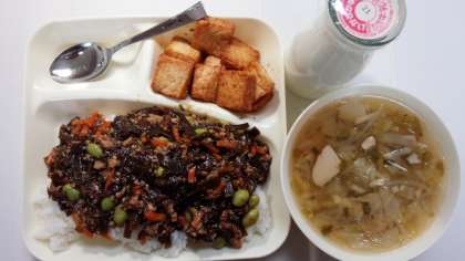 本日のメニューは、もずくと豚ひき肉のジューシー、五目汁、あつあげのしょうがじょうゆがけです。