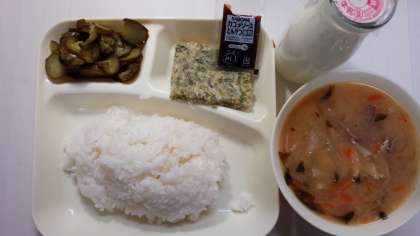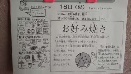 本日の献立は、お好み焼き、豚汁、きゅうりの甘酢づけです。